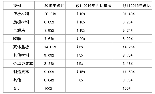 其他部分主要指资金使用成本和环保成本。目前电池企业大都在扩产,而企业的盈利能力根本不足以支撑这种扩张,因此,资金的使用成本很难下降,同时,在环境压力越来越大的现实状况下,环保成本毋庸置疑也不可能下降。这些成本2016年不上升就不错。墨柯这里预计保持2015年的水平。