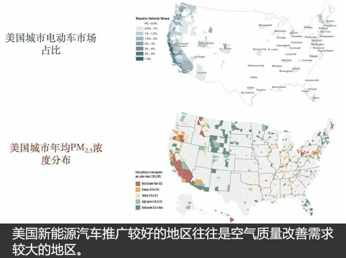 另外一个重要区别是,美国城市已经把新能源汽车推广作为当地空气质量改善的重要推手,并且美国新能源汽车推广较好的地区往往是空气质量改善需求较大的地区。