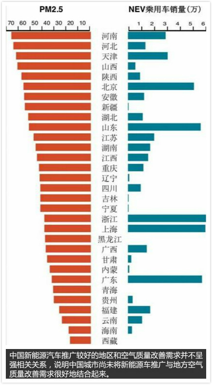 而就2017年中国代表城市及省份的PM2.5浓度及对应的新能源汽车销量看,中国城市尚未将新能源汽车推广与地方空气质量改善需求较好地结合起来,是未来值得探索的重要方向。
