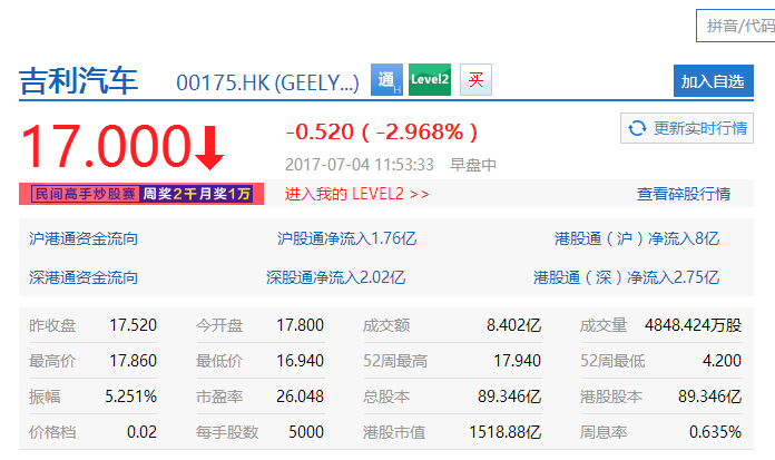 吉利汽车:市值达到1364.94亿元首超广汽集团 位居汽车整车第二