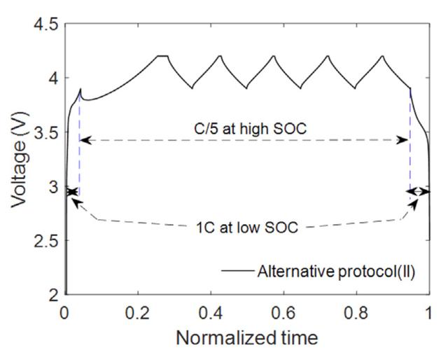 为了压缩化成时间,降低生产成本,美国橡树岭国家实验室在1.5Ah的NCM/石墨软包锂离子电池上设计了一种快速化成的制度(如下图所示),在这一制度下首先以较大的电流(1C)将锂离子电池充电到3.9V,然后以C/5倍率在3.9-4.2V的范围内对锂离子电池进行充放电循环,最后将电池放电到3.0V,相比于以0.05C倍率进行3次循环,该制度下电池的化成时间仅需要14h,化成速度提高8.5倍。这一化成制度的设计思路主要是将负极在较低电势范围内时,充电电流尽量尽可能的小,以使负极形成更为致密和稳定的SEI膜。
