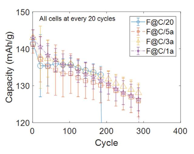 虽然不同的化成电流会导致不同的化成容量发挥,但是在循环过程中我们发现这些电池之间没有明显的差距,在1C/1C倍率下循环的几种电池的容量发挥和循环稳定性几乎相同,表明不同电流下化成的电池,最终负极表面都形成了稳定的SEI膜。因此作者认为采用上述的分段式快速化成制度能够在化成过程中部分的形成SEI膜,然后在锂离子电池使用的前几次循环中最终完成稳定SEI膜的构建,从而在大幅压缩化成时间、降低成本的同时还能够获得相近的循环寿命。
