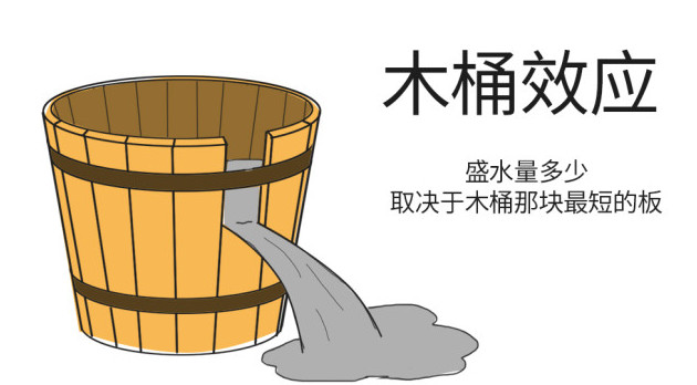 首先我们要先了解一个叫“木桶效应”的理论,一只木桶能盛多少水,并不取决于最长的那块木板,而是取决于最短的那块木板。