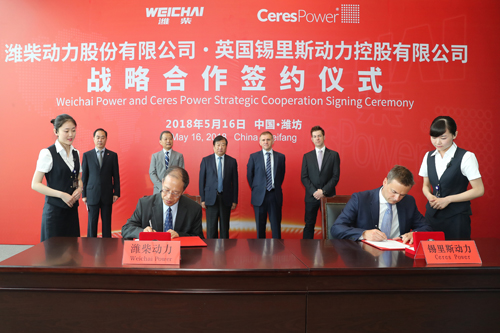 电池(SOFC)供应商英国锡里斯动力控股有限公司(Ceres Power)在山东潍坊签署战略合作协议,潍柴动力拟投资4000余万英镑认购Ceres Power新发行的部分股份,认购完成后持股比例达到20%,并携手Ceres Power计划在中国潍坊成立合资公司,在固态氧化物燃料