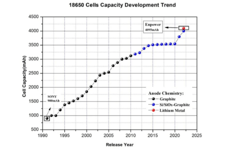 ͼ1A£º18650ï®Àë×Óµç³ØÈÝÁ¿µÄÖðÄêÌáÉý