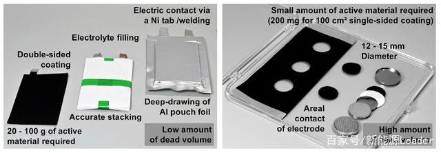 实验室中最常用的电池形式为扣式电池,电池的容量也仅为1-6mAh,而商业中应用的锂离子电池容量通常要达到0.45-1.2Ah,电池的形式也多采用软包设计,以最大限度的提高电池的比能量。电芯也多采用叠片式设计,一方面降低生产的难度,同时也能够更好的控制电池在充放电过程中的体积变化。