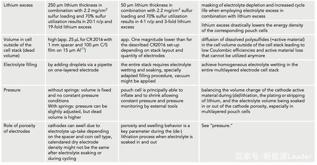 下表中作者对比了实验采用的扣式电池与商业生产采用的软包电池之间的主要差别。在扣式电池中,弹簧垫片和不锈钢垫片能够为材料提供均匀的压力,从而有效的抑制正负极体积变化导致的活性物质和活性锂的损失,同时也能够有效的减少极化,而在软包电池在没有外部压力的情况下则会影响电池的循环稳定性。当然软包电池也具有自己的优势,例如更少的无效空间,更容易控制的注液量,可以控制的外部压力,从而让我们能够更好的控制软包电池的能量密度和循环性能。