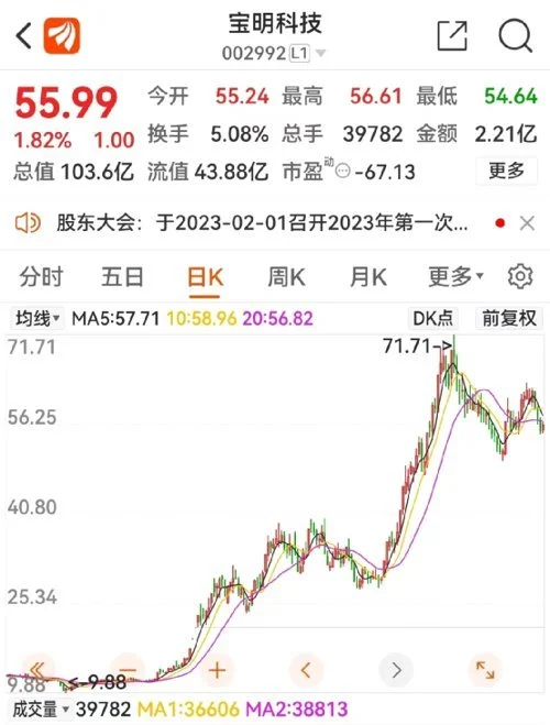 不过,去年下半年的跨界,也令宝明科技成为2022年耀眼的大牛股。宝明科技自去年6月底,开启了长达半年之久的连续上涨模式。从6月20日的12.1元/股,一路上涨至11月 29日的最高价格71.71元/股,半年不到涨幅高达476.88%。而从去年全年来看,宝明科技仍是十足的大牛股,全年涨幅高达312%。
