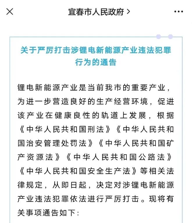 宜春市政府通告称,锂电新能源产业是当前宜春市的重要产业,从即日起,决定对涉锂电新能源产业违法犯罪依法进行严厉打击。