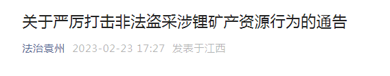 2月23日,江西省宜春市袁州区已发布《关于严厉打击非法盗采涉锂矿产资源行为的通告》显示,为了及时发现、制止、严厉打击私挖盗采矿产资源、破坏生态环境等违法犯罪行为,欢迎广大人民群众积极监督举报,经查证属实给予500至5000元奖励,对举报人信息将严格保密。