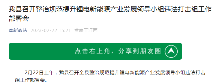 2月22日,宜春下辖的奉新县召开全县整治规范提升锂电新能源产业发展领导小组违法打击组工作部署会。