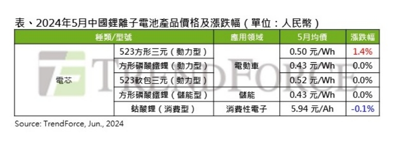 在储能电芯的部分,5月太阳能搭配储能的需求高涨,同时5-6月中国市场储能併网专案进入备货时节,企业订单量保持增长,部分企业产品价格小幅上调,其中,磷酸铁锂储能电芯5月人民币均价0.43元/Wh,较前一季度持平。