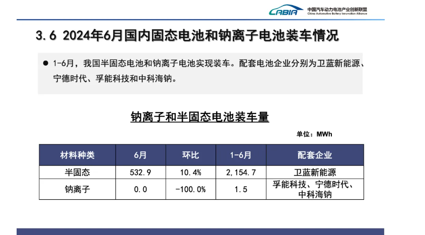 Ŀǰ£¬ÎÒ¹ú°ë¹Ì̬µç³ØÓëÄÆµç³ØÕý¼ÓËÙ½øÈëÉÌÒµ»¯Ó¦Óý׶Ρ£¾ÝÖйúÆû³µ¶¯Á¦µç³Ø²úÒµ´´ÐÂÁªÃË·¢²¼µÄÊý¾ÝÏÔʾ£¬2024ÄêÉϰëÄ꣬ÎÒ¹ú°ë¹Ì̬µç³ØºÍÄÆÀë×Óµç³ØÊµÏÖÁË×°³µ£¬°ë¹Ì̬µç³ØµÄ×°³µÁ¿Îª2154.7MWh£¬ÄÆÀë×Óµç³Ø×°³µÁ¿Îª1.5MWh¡£
