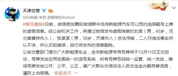 情况通报:日前,微信朋友圈和微信群中流传新能源汽车可以预约选择靓号上牌的虚假信息。经公安机关工作,将通过微信发布虚假消息的刘某(男,45岁,河北省黄骅市人)、张某某(男,38岁,天津市人)依法传唤,二人对违法事实供认不讳,并认识到错误,自行将发布的信息删除。