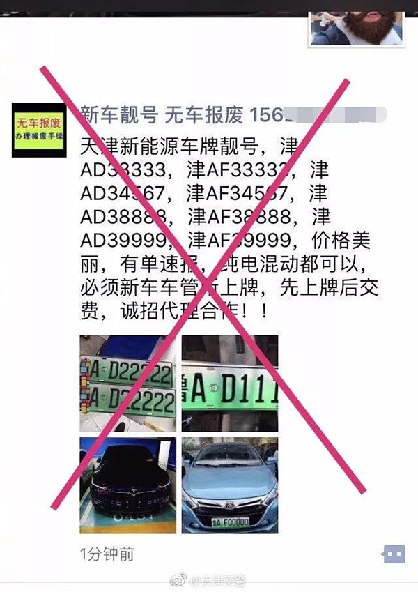 天津交警辟谣:网传新能源汽车可预约靓号上牌系虚假信息