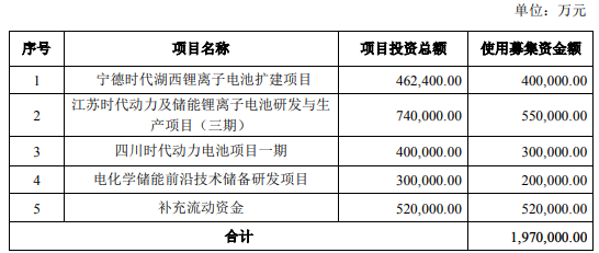 募集资金总额及用途调整方面,募集资金总额从原来的200亿元下调至197亿元,宁德时代湖西锂离子电池扩建项目、江苏时代动力及储能锂离子电池研发与生产项目(三期)、四川时代动力电池项目一期、电化学储能前沿技术储备研发项目的投资金额不变,补充流动资金减少3亿元。