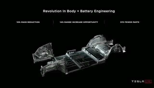 整车电池一体化方面,特斯拉在电池设计上简化了电池结构,移除了电池组间不必要的部件,使电池体积减少了35%。新电池结构减少了约370个不必要的电池部件,将降低10%的电池重量并提升14%的续航能力。