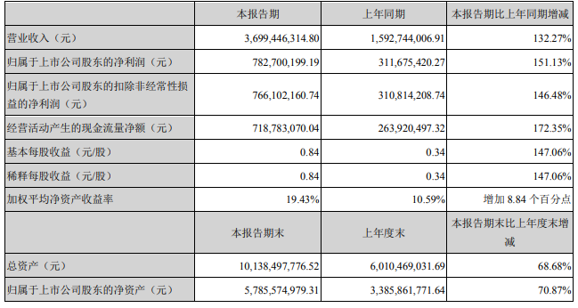 同一天,天赐材料还发布了2021年半年报,公司上半年实现营业总收入36.99亿元,同比增长132.27%;归属母公司股东净利润7.83亿元,同比增长151.13%。