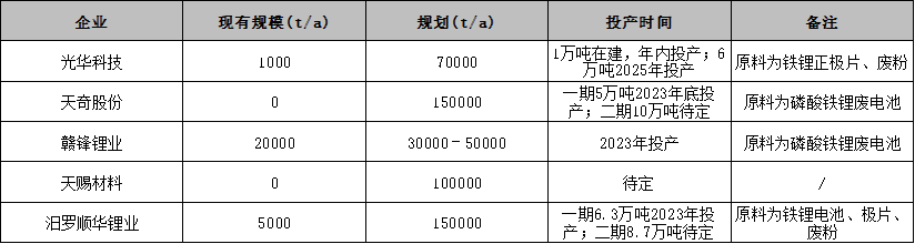 表二、国内一些现有/规划磷酸铁锂再生利用项目