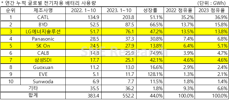 韩系动力电池三大巨头的市占率同比下降1.1个百分点至23.4%,但三家公司的装车量均实现增长。LG新能源同比增长47.2%,为76.1GWh,居全球第3;SK On同比增长13.8%,为27.9GWh,排名第5;三星SDI同比增长42.1%,为25.1GWh,排名第7。