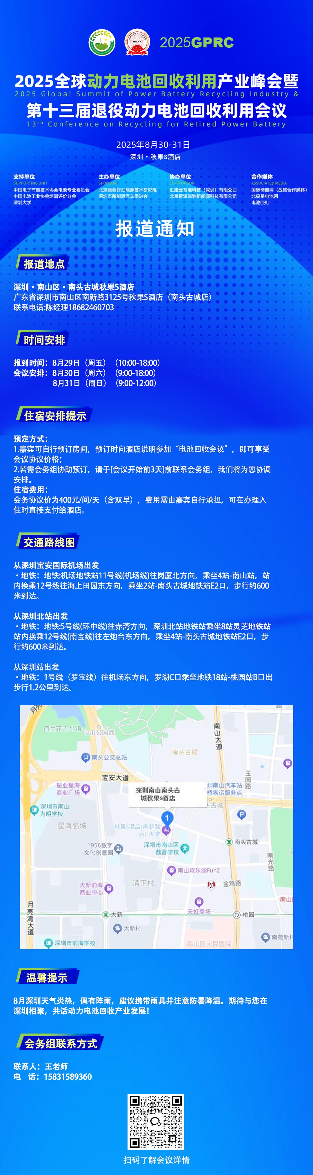 “2025 È«Çò¶¯Á¦µç³Ø»ØÊÕ²úÒµ·å»áôßµÚÊ®Èý½ìÍËÒÛ¶¯Á¦µç³Ø»ØÊÕ»áÒé” ½«ÓÚ 2025 Äê 8 Ô 30 ÈÕÖÁ 31 ÈÕÔÚÉîÛÚ・ÄÏÍ·¹Å³ÇÇï¹û S ¾ÆµêÕÙ¿ª¡£ÎªÈ·±£¸÷λ¼Î±ö˳Àû²Î»á£¬ÏÖ½«±¨µ½¼°»áÒéÏà¹ØÊÂÒË֪ͨÈçÏ£º